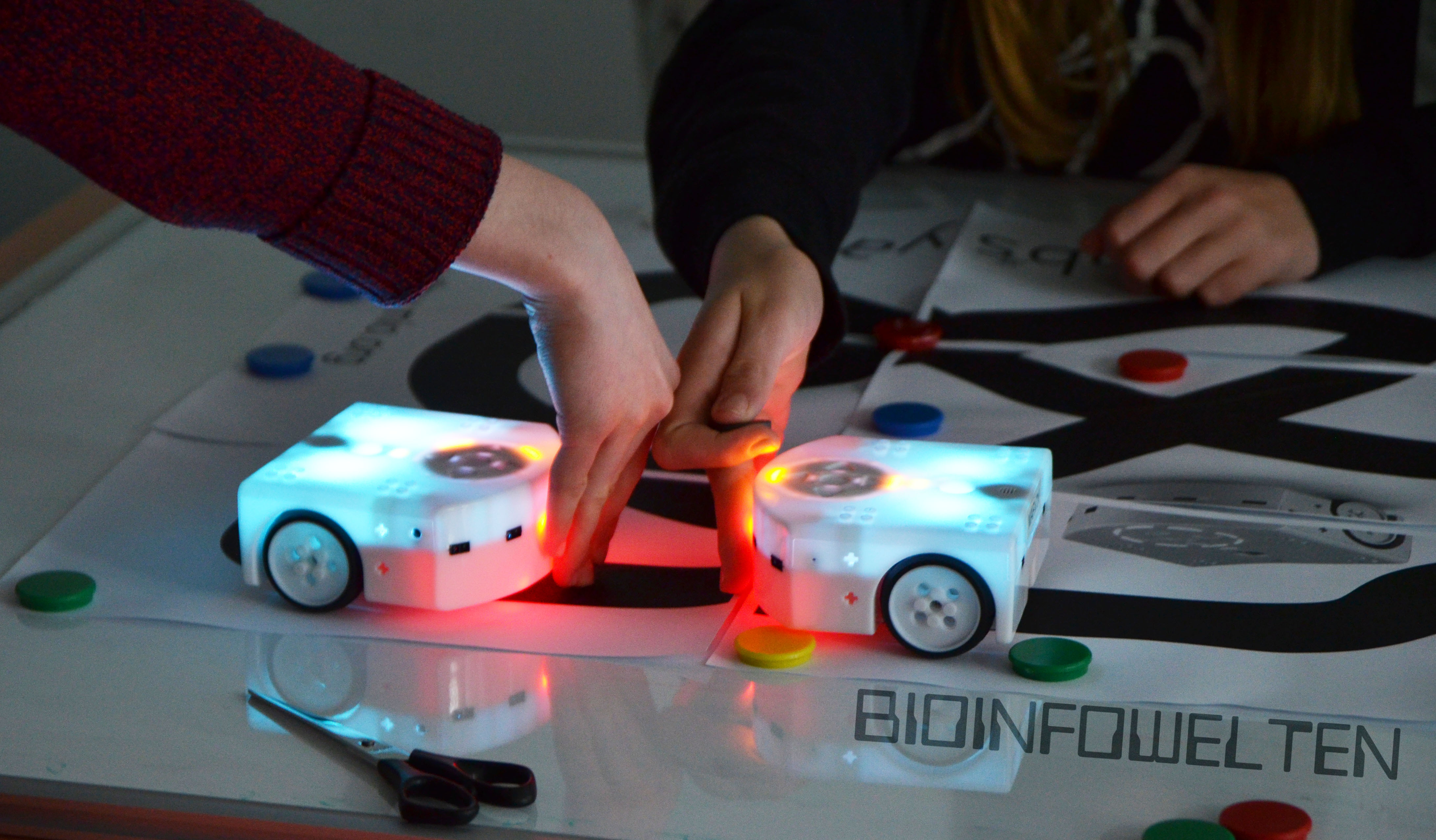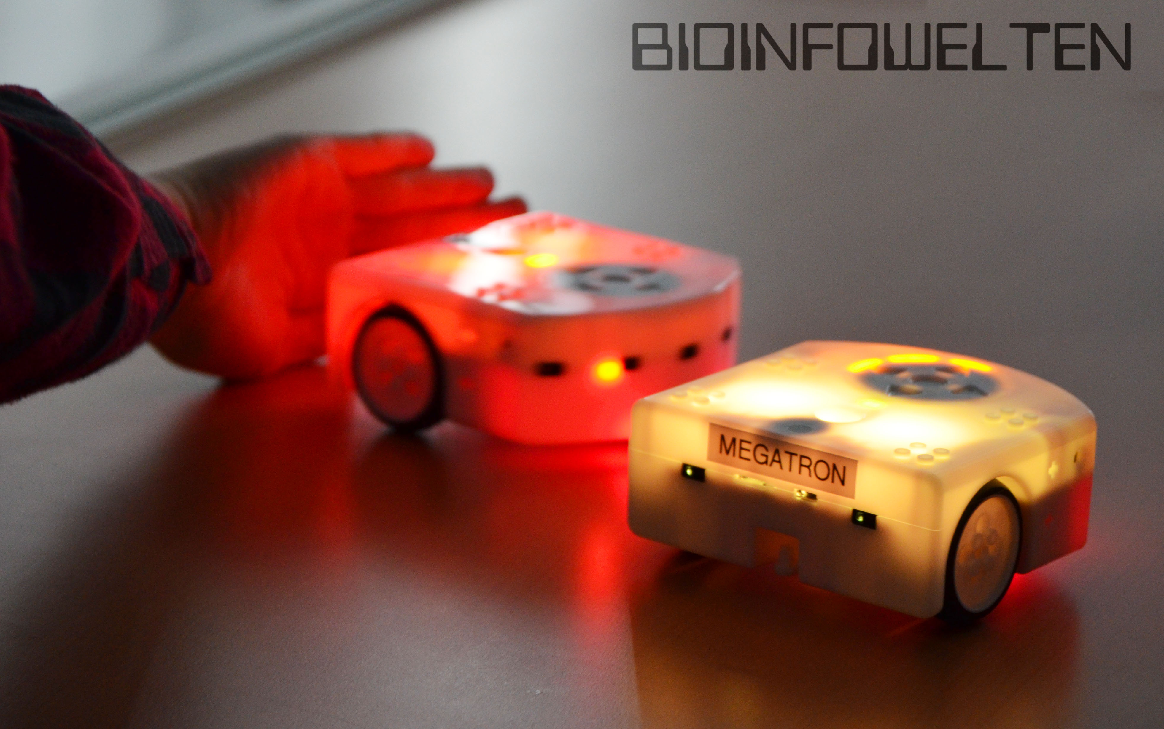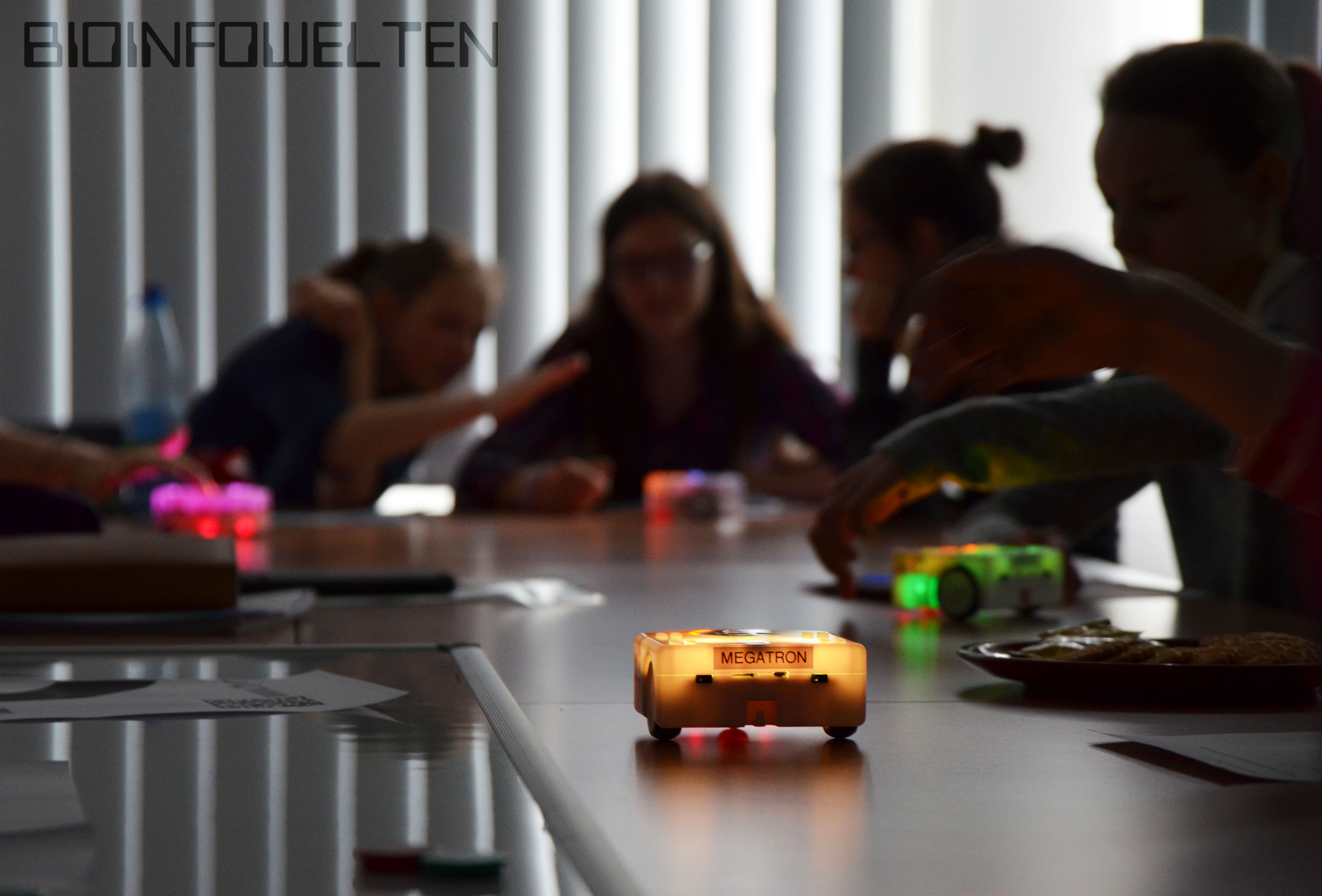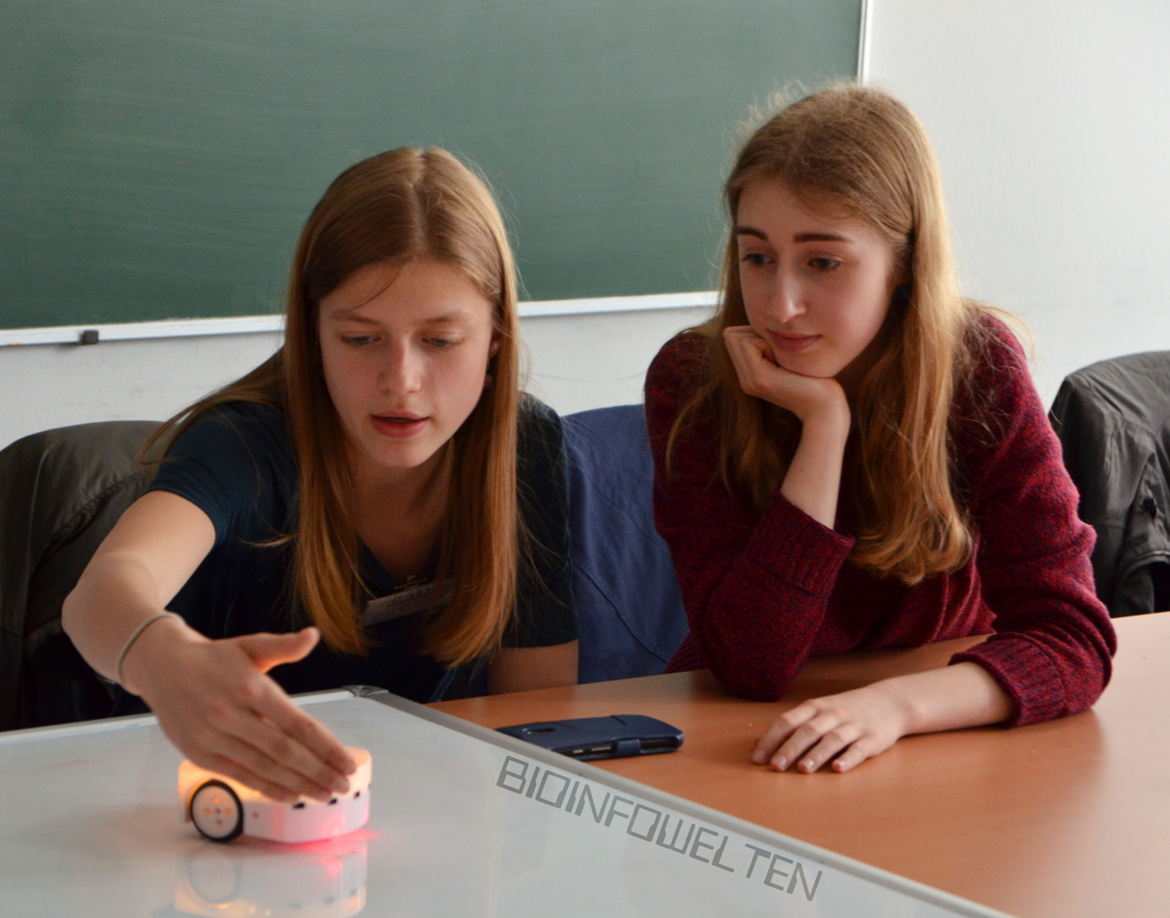 Sebastian hat auch ein paar Agenten mitgebracht: kleine Roboter, denen ein bestimmtes Verhalten programmiert wurde. Als Gruppe zeigen die Roboter komplexe Verhaltensweisen ähnlich dem Verhalten eines Vogelschwarms. Jeder einzelne gehorcht jedoch ganz einfachen Regeln. Welchen Regeln? Das galt es für die Mädchen in kleinen Forschungsteams herauszufinden.