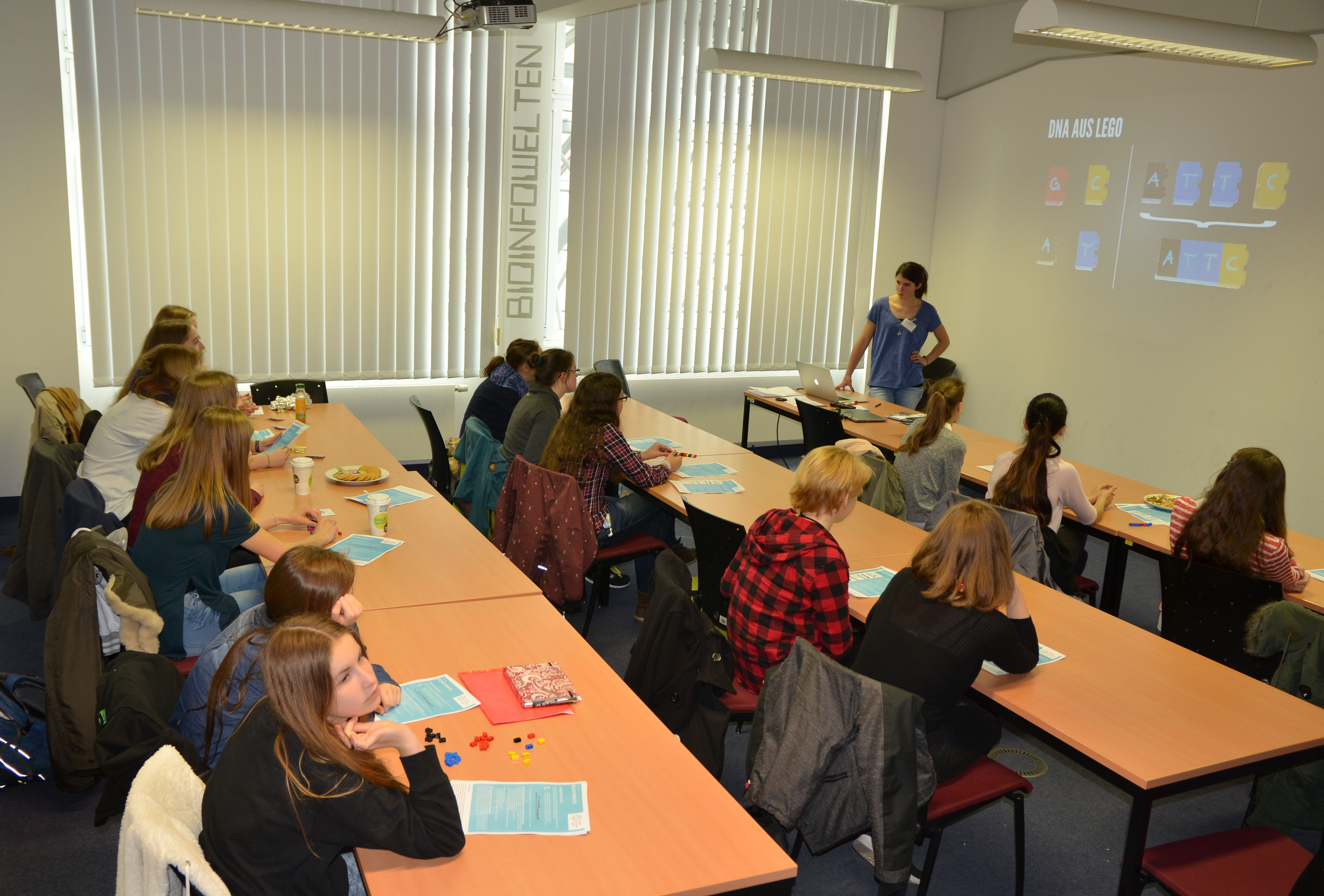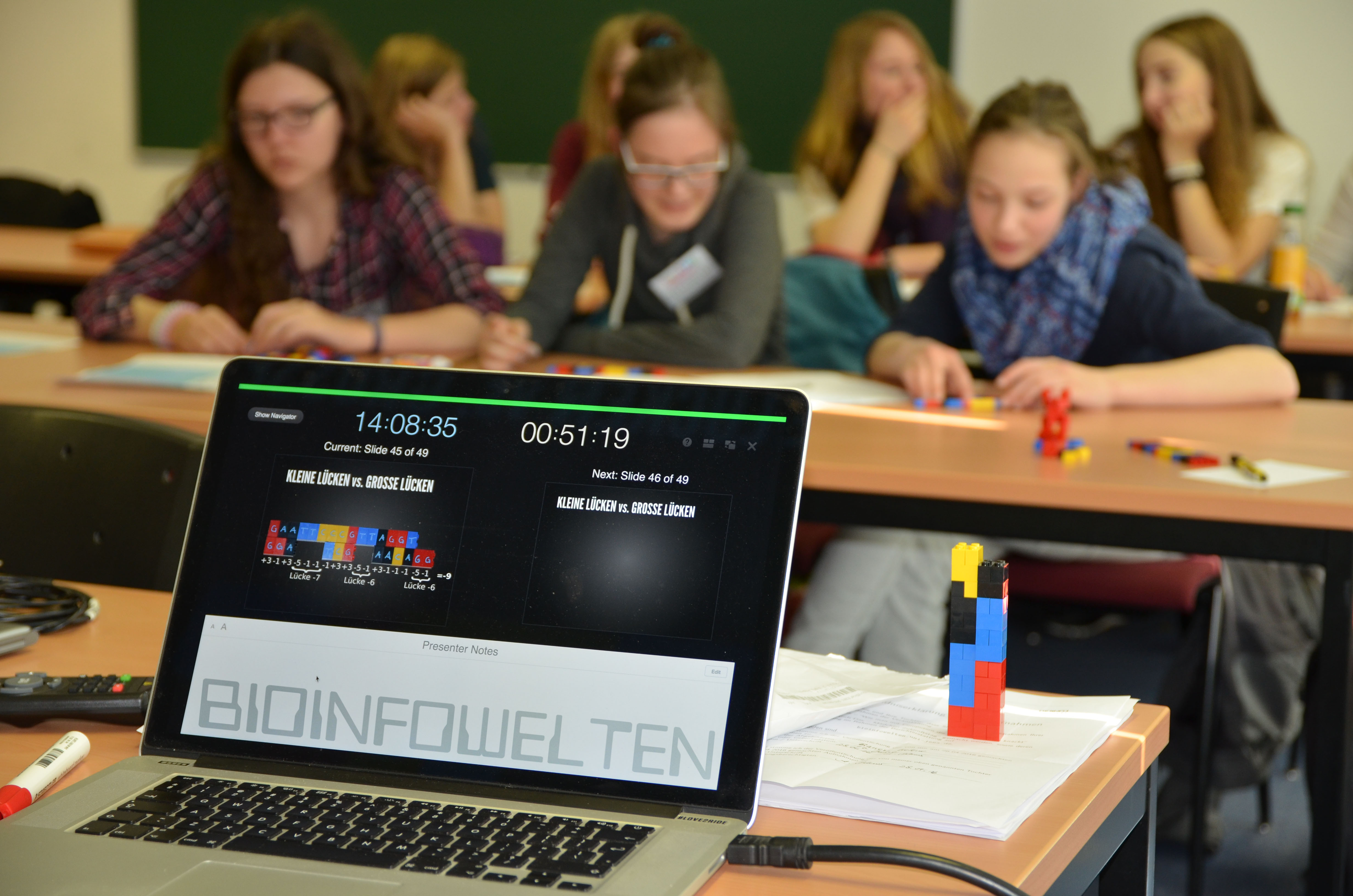Die Aufgabe der Mädchen war es aber nicht etwa, Lego-Steine aneinander zu reihen. Ein bisschen Bioinformatik sollte es ja schon sein. Also ging es kurzerhand daran, den DNA-Code zu entschlüsseln. An der Lego-DNA lernten die Schülerinnen, wie man zwei DNA-Ketten miteinander vergleicht, welche Probleme man dabei beachten muss, und wie schwierig es sein kann, die richtige Lösung zu finden. Denn da gab es mal eben über 156 Millionen verschiedene Möglichkeiten unter denen die richtige Lösung versteckt war. Die Mädchen haben sie übrigens gefunden!